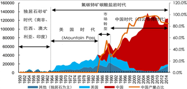 白云鄂博总体矿区不大,但就在这十多平方公里范围内,却蕴藏了约20亿吨铁矿石资源量,铌资源量大于270万吨,稀土氧化物储量为3600万吨,资源量超亿吨,是世界上最大的稀土矿床。白云鄂博矿最早于1927年地质学家丁道衡所发现,最一开始是做为铁矿来开采,1935年何作霖先生发现这里面有两种含稀土的矿物,一开始叫它们白云矿和鄂博矿,实际上后来证实白云矿就是氟碳铈矿,而鄂博矿就是独居石(磷铈镧矿)。白云鄂博矿里面有一百六七十种矿物,含稀土元素的不到一半,最重要的就是氟碳铈矿和独居石。