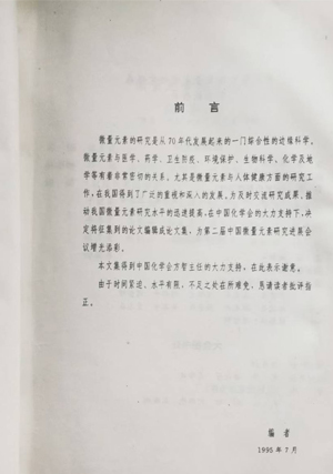 微量元素的研究是70年代发展起来的一门综合性边缘科学。微量元素与医学、药学、卫生防疫、环境保护、生物科学、化学及地学等有着非常密切的关系。尤其是微量元素与人体健康方面的研究工作,在我国得到了广泛的重视和深入的发展。为及时交流研究成果、推动我国微量元素研究水平的迅速提高,在中国化学会的大力支持下,决定将征集到的论文编辑成论文集,为第二届中国微量元素研究进展会议增光添彩。